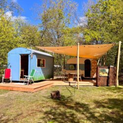 Keet Jut en caravan Jul vormen samen een hemelsblauw duo met ieder een eigen karakter. Hij robuust en zij rond en kleurrijk. Ze staan samen op één van de mooiste en ruimste plekken van de camping, direct aan de bosrand. Met een zit- en slaapkamer, ruime veranda, afdak, buitenkeuken en genoeg ruimte voor vier (of wel vijf) zit je er dubbel zo lekker bij.